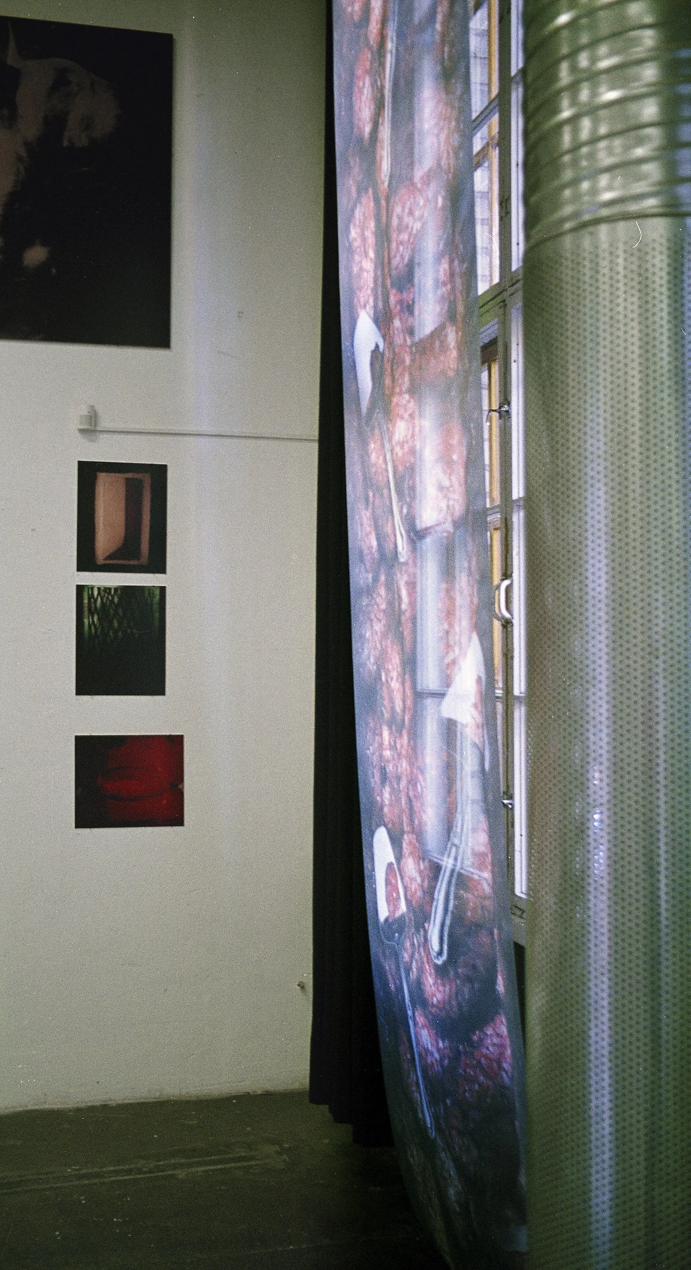HIDAS LOBOTOMIA, koko 500 x 100 cm, tekstiili (tylli), The Script, Valokuvataiteen II triennaali, 1995. Teos kuvassa Valokuvataiteilijoiden Art fair -teosvälitys, Kaapelitehdas, Helsinki, 2000